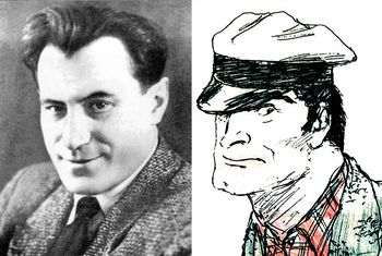 В. П. Катаев и иллюстрация Кукрыниксов из издания «Золотой теленок» И. Ильфа и Е. Петрова.